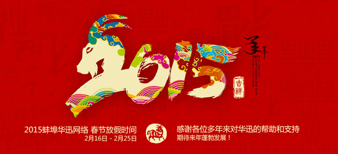 三羊開泰,五福臨門,又是一年春來到。值此新春佳節之際,蚌埠華迅網絡科技有限公司在此恭祝各位新老朋友身體健康,事業發達,闔家幸福,萬事如意,羊年 洋洋得意發洋財!感謝各位多年來對華迅的幫助和支持,期待來年共襄盛舉!