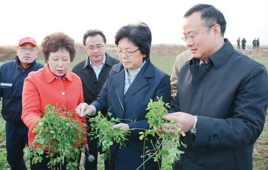 3日下午,李斌一行首先來到位于五河縣朱頂鎮的全國最大的紫花苜蓿生產基地——秋實草業有限公司調研。在市委書記周春雨、代市長白金明的陪同下,李斌深入田間察看牧草長勢,當她得知牧草品質上乘,草場機械化作業達到世界先進水平時,不住地點頭稱贊。調研中,李斌和在這里打工的女拖拉機手、朱頂鎮小柳村村民劉小紅拉起家常,希望她通過自己的努力過上更加幸福美好的生活。