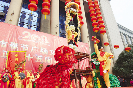 作為2013年蚌埠市春節廣場文化活動的壓軸大戲,整場演出共有來自禹會區文化館、蚌山區文化館和龍子湖區文化館的8支花鼓燈表演隊先后登臺獻藝,一個小時的演出吸引了上千名市民駐足觀看。據市文廣新局負責人介紹,這8支花鼓燈隊伍從全市一百多支花鼓燈藝術團中脫穎而出,聚集在科學宮廣場上表演,為市民送上元宵節藝術大餐。