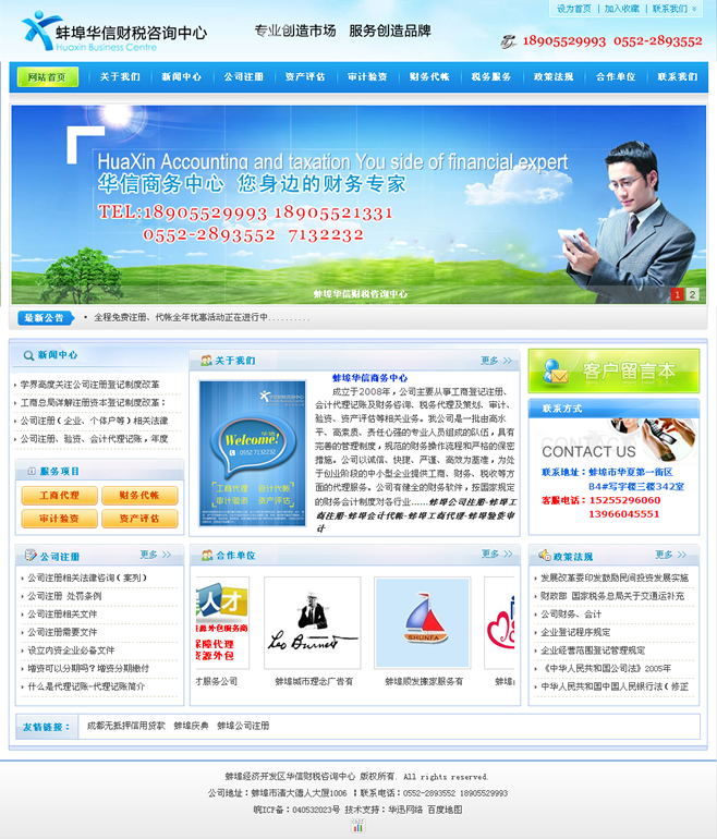 核心提示:蚌埠華信商務中心 成立于2008年,公司主要從事工商登記注冊、會計代理記賬及財務咨詢、稅務代理及策劃、審計、驗資、資產評估等相關業務。我公司是一批由高水平、高素質、責任心強的專業人員組成的隊伍,具有完善的管理制度,規范的財務操作流程和嚴格的保密