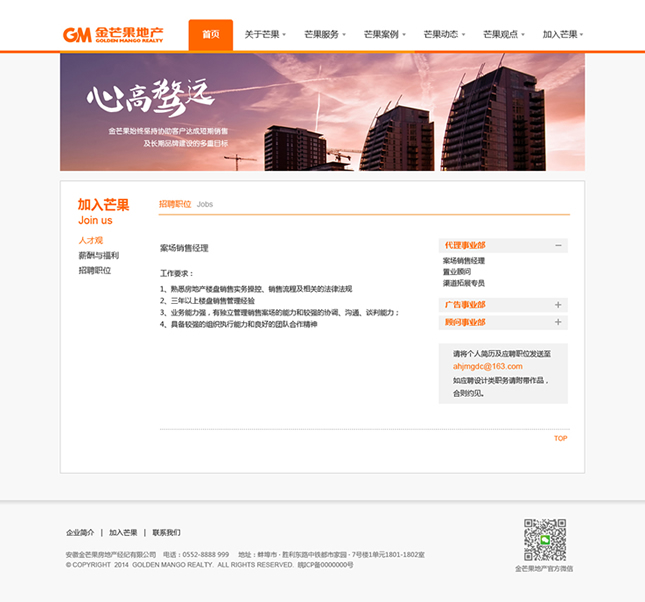 公司秉承“專業至上,服務至誠”的經營理念,服務范疇涵蓋項目開發全程技術顧問、全程營銷策劃及銷售代理等。作為專業的房地產經紀服務機構,公司下設四部,即:顧問事業部、廣告事業部、代理事業部、二手房事業部。每個版塊既是獨立的運作體系,集合起來又是一支多專業組合的精銳部隊,統一的作戰部署,統一的行動計劃,統一的戰略目標,堅無不摧,戰無不勝!